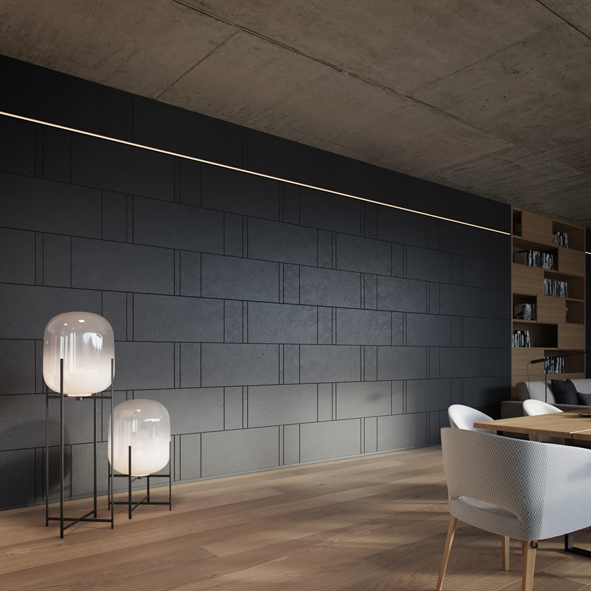 Le panneau mural SCURETTO évoque la pierre de taille et sa structure minérale. Avec ses fines découpes, l'élément offre une grande variété de combinaisons pour un résultat éminemment contemporain. Répétitions, inversions, rotations, insertions... C'est dans cet esprit de modularité et d'asymétrie que cet élément de design unique a été conçu. Les profilés de finition FL11 et WL10 ont été spécialement conçus pour compléter la composition murale créée avec le modèle SCURETTO.
